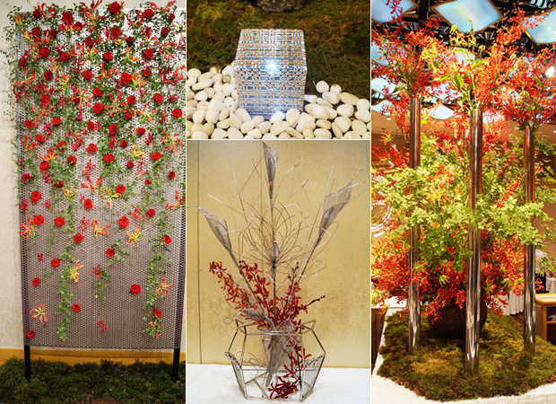 花装飾+パンチングメタル、ライト、ステンレス製花瓶作品、花装飾+パイプ